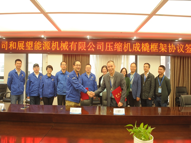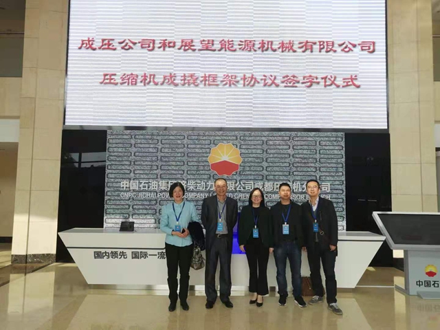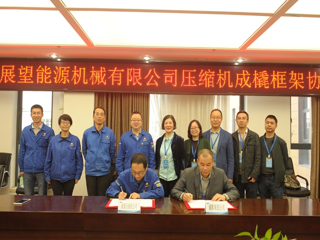 2019年10月29日中国石油集团济柴动力有限公司成都压缩机分公司与成都展望能源机械有限公司在成压公司签署了《压缩机成撬合作框架协议》,并成功签订了一台2CFA的主机订单。协议的签署标志着成都展望能源机械有限公司成为国内首家使用成压公司机头进行成撬的压缩机成撬服务商,同时也开启了公司和中石油企业合作的新模式。双方将通过在成撬、服务等方面的战略合作丰富产业链,实现强强联合,共谋转型发展新篇章