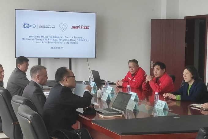 3月28日,美国Ariel压缩机公司Mr.Derek,Mr.Derrick ,Mr.Union Cheng,Mr.Denis Deng莅临公司参观指导工作。公司总经理蒋周密,副总经理王楷、邱艳、刘建新等高层领导全程陪同。